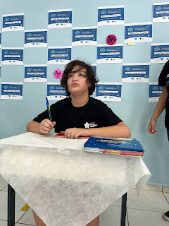 Na manhã de sábado, dia 28/10, realizamos uma sessão de autógrafos, com dinâmicas desenvolvidas pelas professoras das turmas envolvidas no projeto. Cada exemplar vendido para familiares e amigos foi entregue ao adquirente devidamente acompanhado de uma dedicatória do autor, o qual teve a oportunidade de experimentar um pouco da emoção e glamour sentido por um escritor ao lançar sua obra numa sessão de autógrafos.